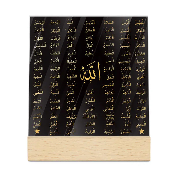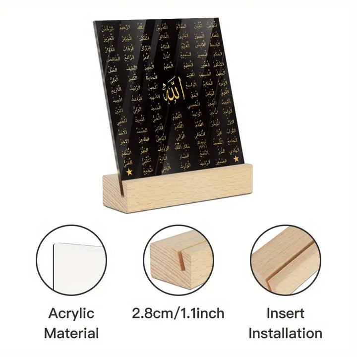 This tabletop decor piece features the word Allah in graceful script, resting on a sturdy wooden base — perfect for adding spiritual warmth to your home or office.