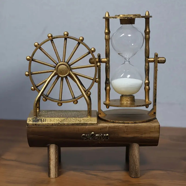 This Gold Finish London Eye & Hourglass Ornament beautifully blends modern sophistication with a touch of nostalgia. Featuring a detailed London Eye structure and a flowing hourglass centerpiece, it’s a striking decor piece for any space.