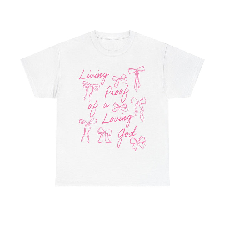 This white t-shirt beautifully shares a heartfelt message: “Living Proof of a Loving God.” Accented with delicate pink bows, it blends sweet style with uplifting spirit — perfect for everyday wear or gifting with meaning.