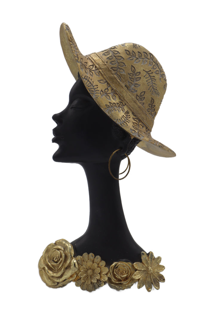 This Decorative Black Mannequin Head features a striking gold hat adorned with delicate flowers, making it a standout piece for any space. Sophisticated and artistic, it adds flair to vanities, shelves, or creative studio setups.